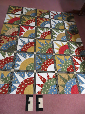 I've finished 20 of the 32 border blocks I need.  This picture gives an idea of how I'm going to arrange them.  I think this quilt will need at least one more border before it tells me it's done.